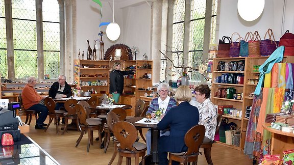 Bei einer Tasse fair gehandeltem Kaffee oder Tee können die Gäst*innen verweilen, ins Gespräch kommen und sich mit dem vielfältigen Warenangebot der Klosterstube vertraut machen.