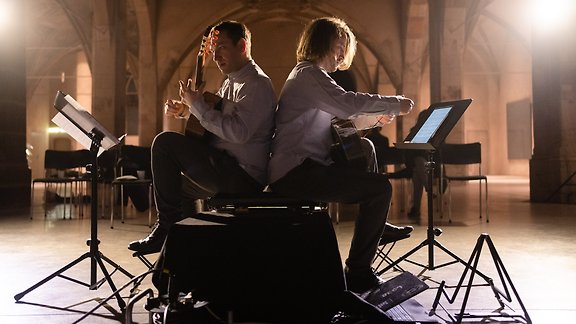 Das Gitarrenduo Henrik Dewes und Tobias Klich setzt seinen Schwerpunkt auf die Initiierung neuer Werke, die die Ausdrucksmöglichkeiten der Gitarre mit inspirierender Phantasie erweitern. In enger Zusammenarbeit mit Komponistinnen und Komponisten entstanden u. a. Stücke von Farzia Fallah und Jamilia Jazylbekova. Zu hören ist außerdem das preisgekrönte Solostück „Elixier“ von Henrik Dewes, das 2024 mit dem Preis des Deutschlandfunk beim Deutschen Musikwettbewerb Komposition ausgezeichnet wurde. Ergänzt wird das Programm durch die selten gespielte „Sonate für Harfe zu vier Händen“ des französischen Komponisten und Harfenisten Marie-Martin Marcel de Marin, in einer Bearbeitung für Gitarre zu vier Händen von Tobias Klich. Eine Raumkomposition von Klaus Huber rundet den Abend ab. Eintritt 10 Euro.