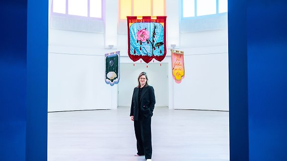 Die Direktorin der Kestner Gesellschaft, Eva Birkenstock führt durch die laufende Ausstellung „The Volcano Manifesto“ von Cauleen Smith.