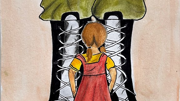 Die riesigen Stiefel der SS-Männer, die in der Nacht des 9. November 1938 die Wohnung der Familie Kleeberg stürmen und der kleinen Ruth Angst einjagen. Der Blick auf das Gestapo-Gefängnis, in dem Ruths Vater Erich seiner Tochter liebevolle Briefe aus der Gefängniszelle schrieb, bevor man ihn deportierte. Ein Kastanienbaum als stiller Zeuge der Ermordung von Häftlingen in der „Laubhütte“ auf dem Gelände der einstigen Israelitischen Gartenbauschule. Erinnerungen und Biografisches aus dem Leben der Zeitzeugin Ruth Gröne haben Schüler*innen des Gymnasiums Limmer künstlerisch umgesetzt und in Bilder übertragen.